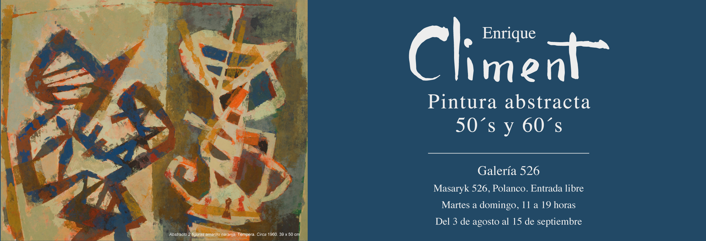 Esta exhibición centra su discurso curatorial en el trabajo realizado durante la década de los cincuenta y sesenta por el artista español avecindado desde finales de la década de 1930 en nuestro país. En este periodo la producción pictórica de Climent es de una marcada abstracción misma que sería influencia para los nóveles artistas de la llamada Generación de la ruptura, los cuales buscaban nuevas soluciones plásticas a los discursos nacionalistas.